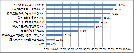 事務的な負担が大きい一方で、職員の意識改革や予算への反映など期待した効果が十分でないと捉えられており、コストに見合った成果が得られていないと感じている団体が少なくないと言える。