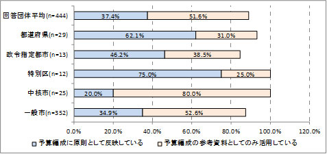 しかし、行政評価の結果を予算編成に原則として反映している団体は4割弱に留まっている。特に中核市においては、原則として反映している団体は2割に過ぎない。このため、地方公共団体における行政評価は、目的に即した実効性が十分担保されているとは言い難い状況にあると言える。