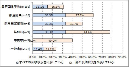 前述の通り、行政評価の目的として、市民への説明責任を果たすことをあげる団体も多いが、最も重要な、行政評価結果の予算への反映状況を公表している団体の割合は約3割に留まり、中でもそのすべてを公表している団体は15.1%に留まっている。特に、一般市において、一部公表も含め、公表している団体が2割強に留まっていることが特徴としてあげられる。