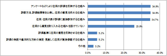 また、行政評価に市民の意見を反映する取組の実施状況についても、アンケートによる反映や評価結果等への意見募集、直接参加などの機会を設けている団体が、それぞれ全体の約1/3に留まり、逆に約1/4の団体は住民の意見を反映する仕組みを設けていないなど、取組は十分とは言い難い状況にある。
